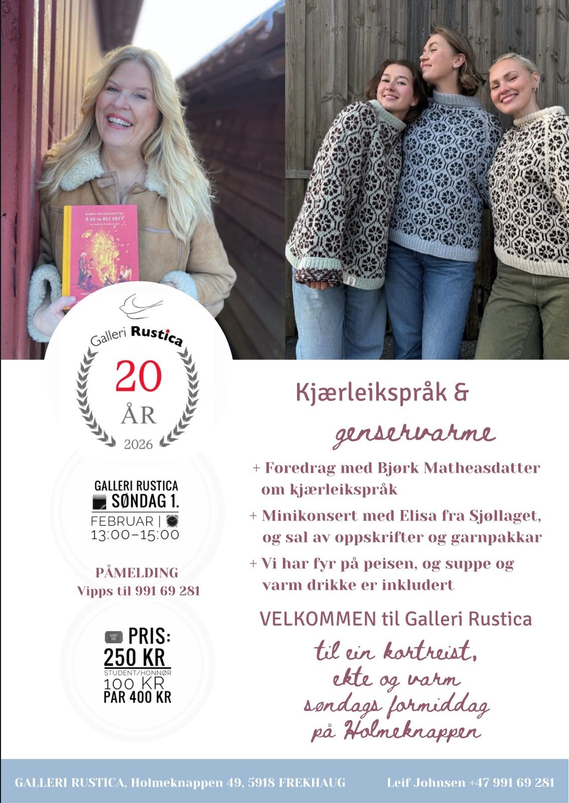 Galleri Rustica, Bjørk og Sjøllaget skaper saman ei stemning av varme, kreativitet og fellesskap – midt i vinterkulda, med peis, varm drikke og ein liten minikonsert med Elisa. Dette er kortreist, ekte og varmt – akkurat slik vi likar det.